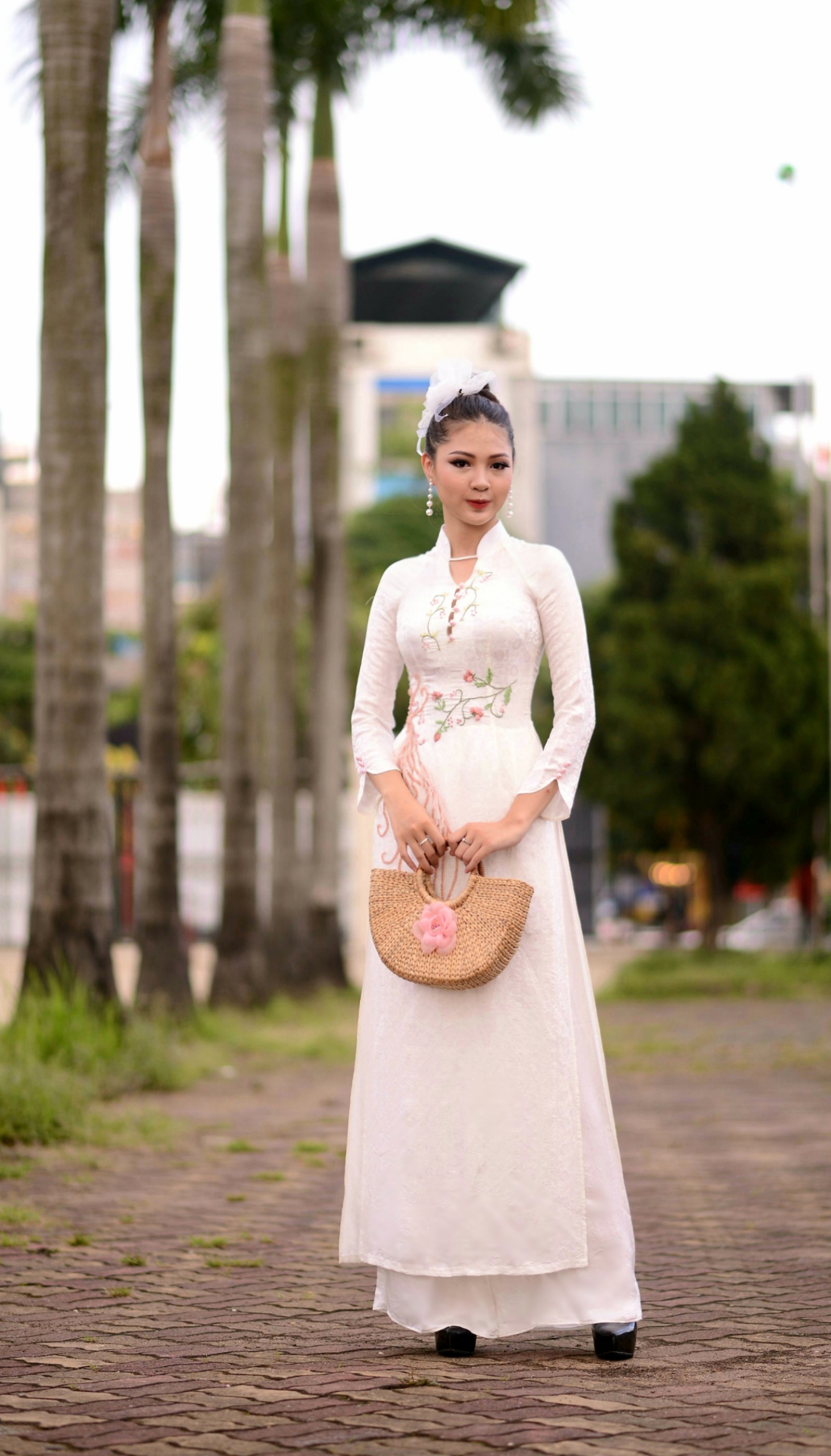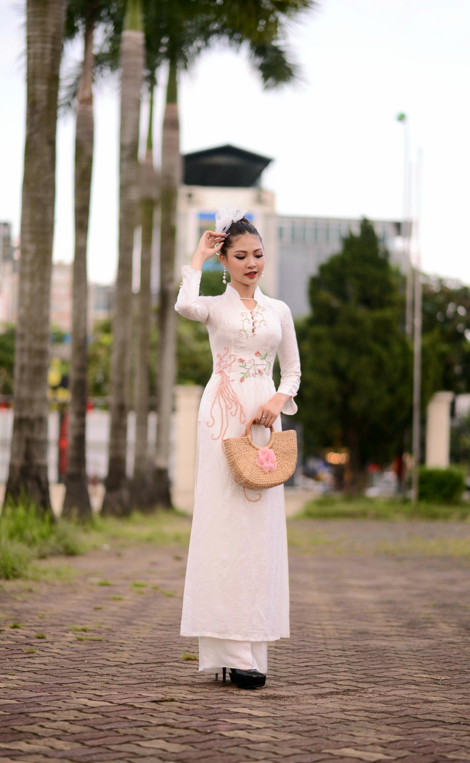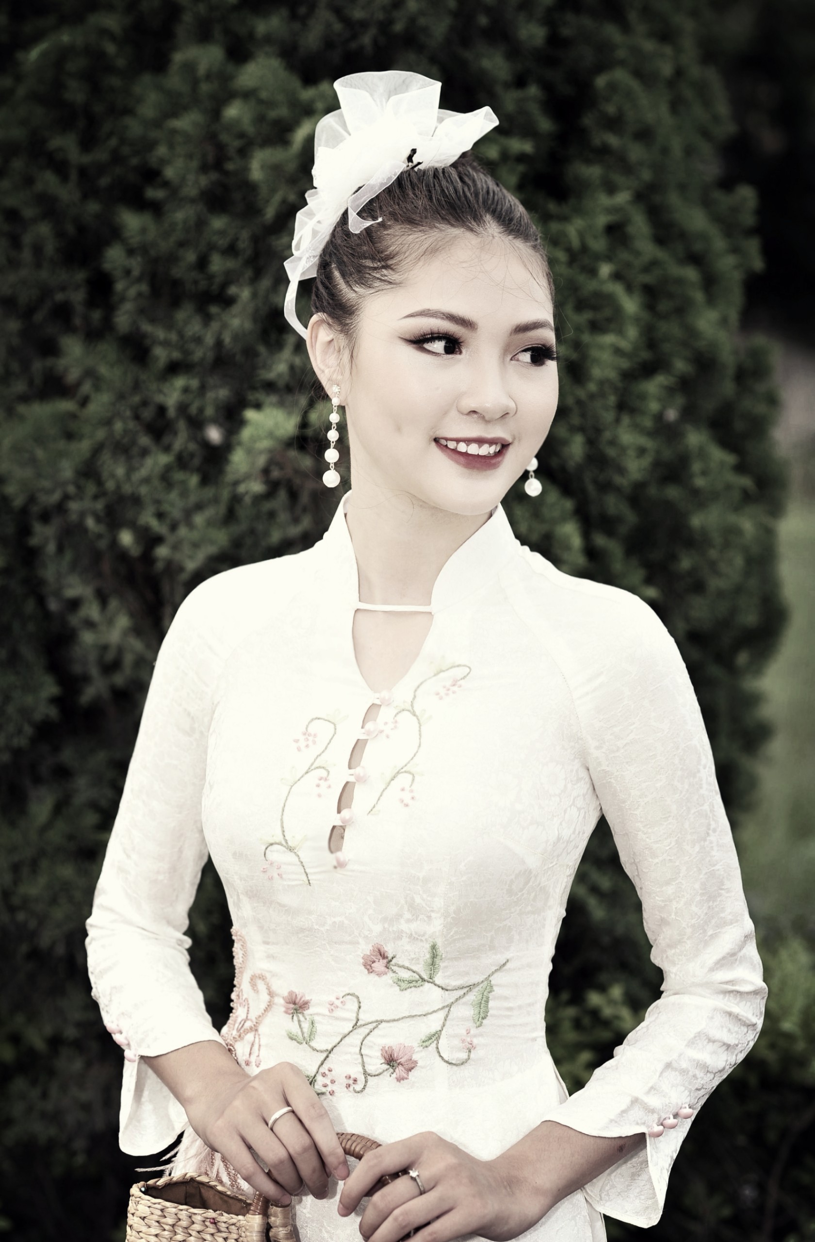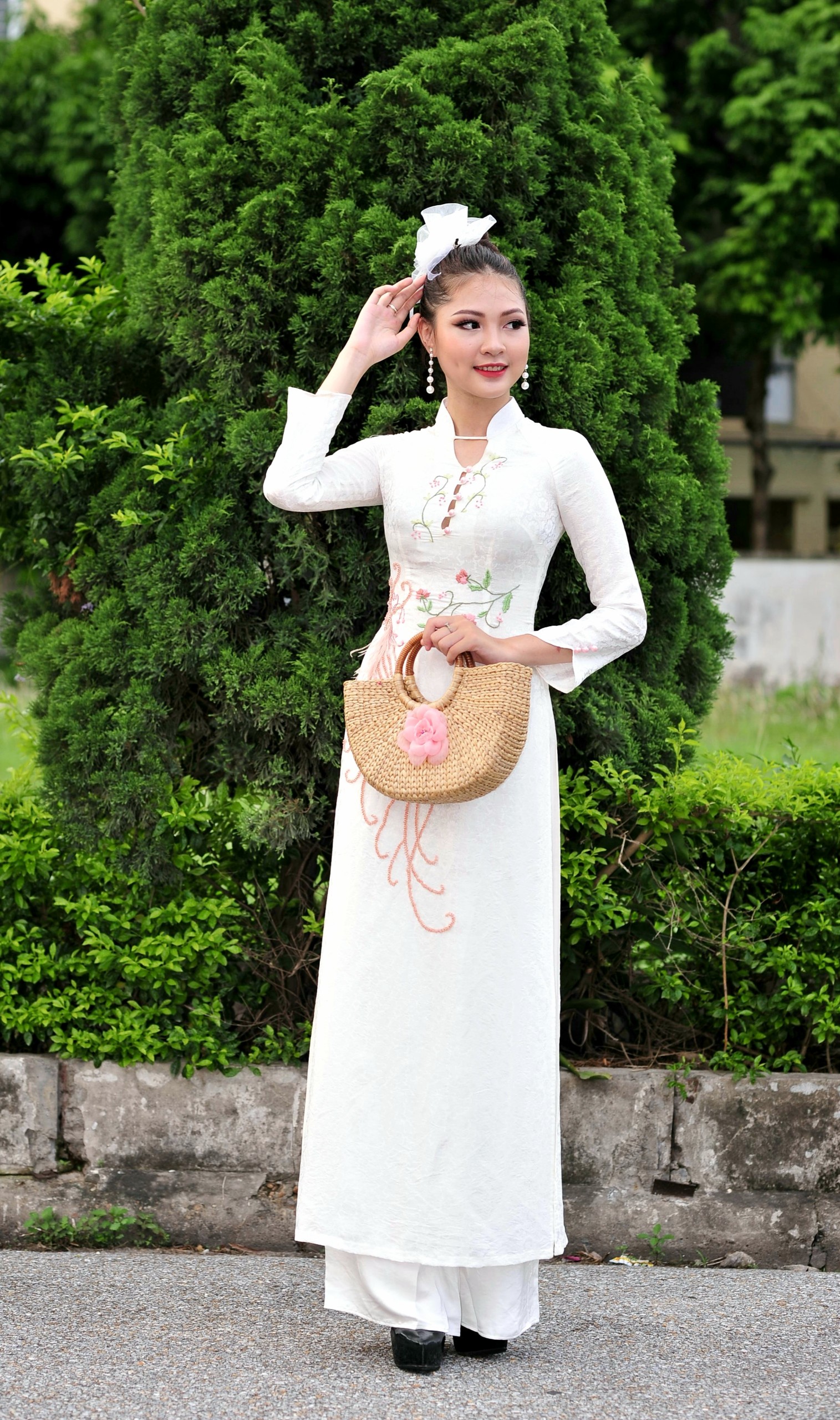 Với gam màu trắng thanh khiết, vải lua vân hoa cúc nổi tiếng đặc trưng của làng nghề Vạn Phúc, áo được trang trí bằng hoạ tiết chim phượng hoàng được thêu và kết cườm tinh xảo. Chim phương hoàng còn là biểu tượng của đức hạnh và duyên dáng, thanh nhã, cũng biểu thị cho cuộc sống hôn nhân hòa hợp và hạnh phúc. Các cô dâu trong chiếc áo Tố Thanh kết hợp với bông hoa cài tóc mới lạ sẽ trở nên duyên dáng, thanh tú hơn, vừa mang nét cổ điển của người con gái xưa vừa có tính hiện đại hợp xu thế.