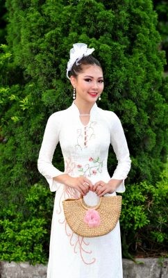 là tên gọi của mẫu áo dài thứ đầu tiên trong BST THANH MAI mà Hường Handy muốn chia sẻ. Với gam màu trắng thanh khiết, vải lua vân hoa cúc nổi tiếng đặc trưng của làng nghề Vạn Phúc, áo được trang trí bằng hoạ tiết chim phượng hoàng được thêu và kết cườm tinh xảo. Chim phương hoàng còn là biểu tượng của đức hạnh và duyên dáng, thanh nhã, cũng biểu thị cho cuộc sống hôn nhân hòa hợp và hạnh phúc. Các cô dâu trong chiếc áo Tố Thanh kết hợp với bông hoa cài tóc mới lạ sẽ trở nên duyên dáng, thanh tú hơn, vừa mang nét cổ điển của người con gái xưa vừa có tính hiện đại hợp xu thế.