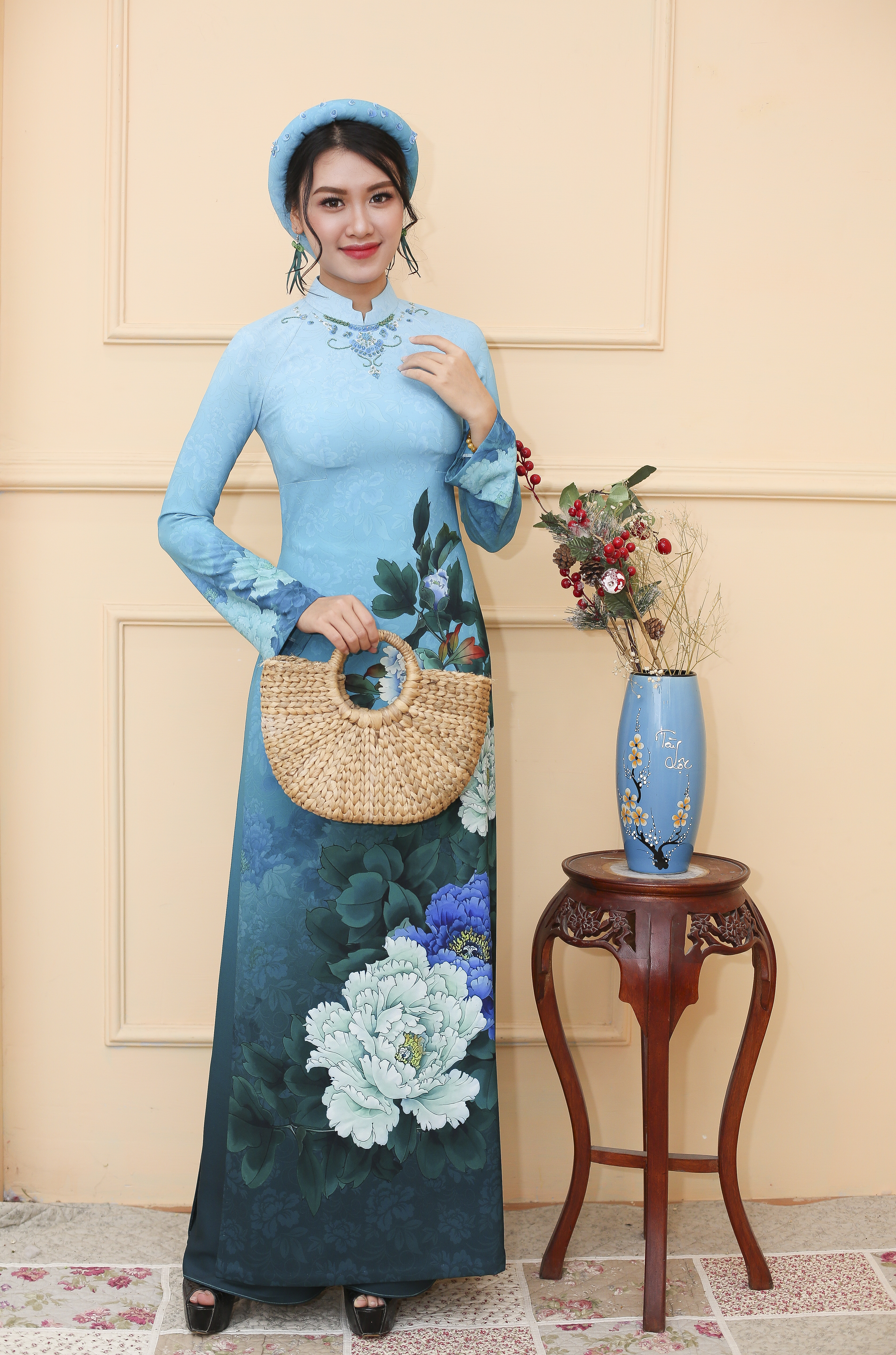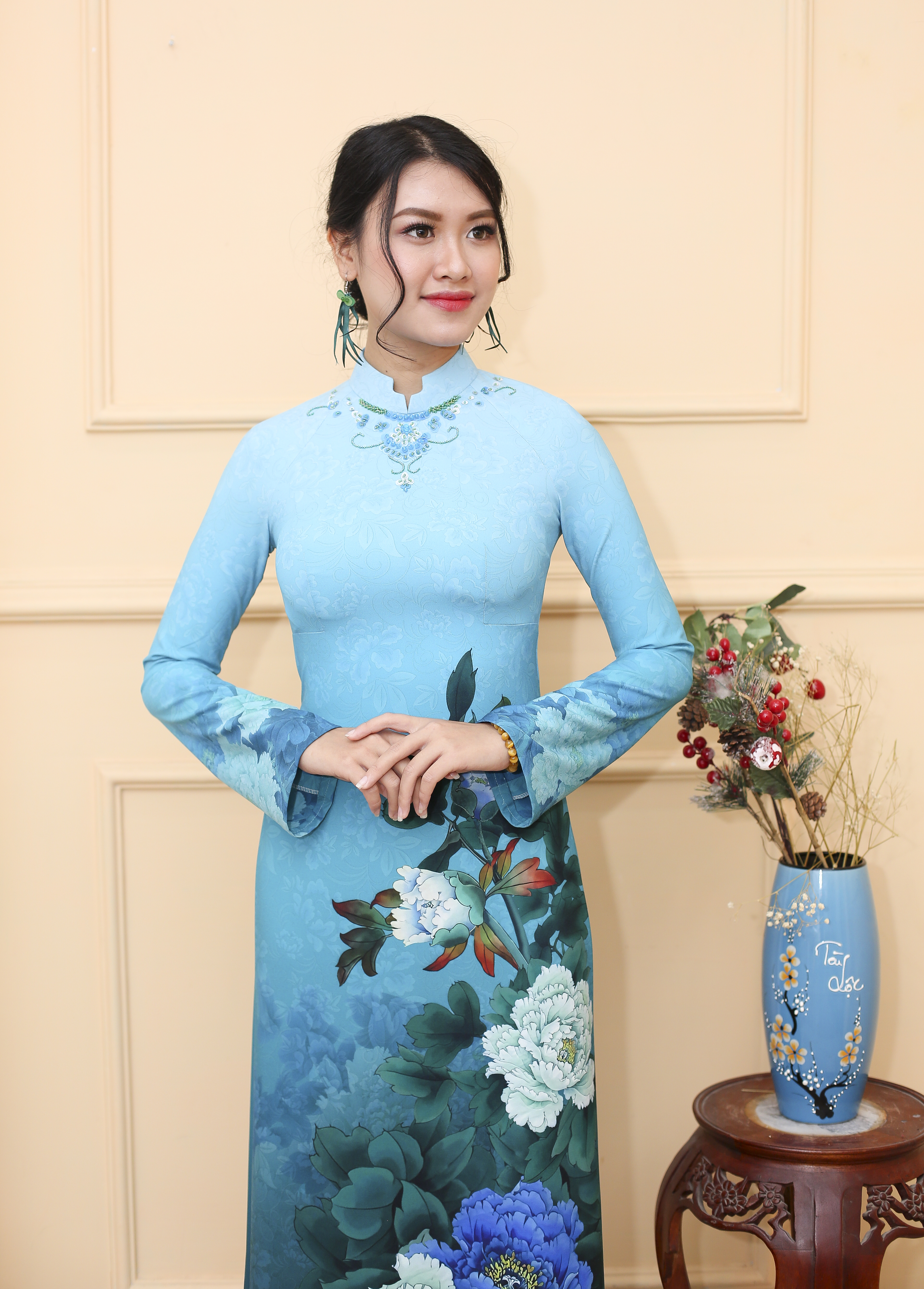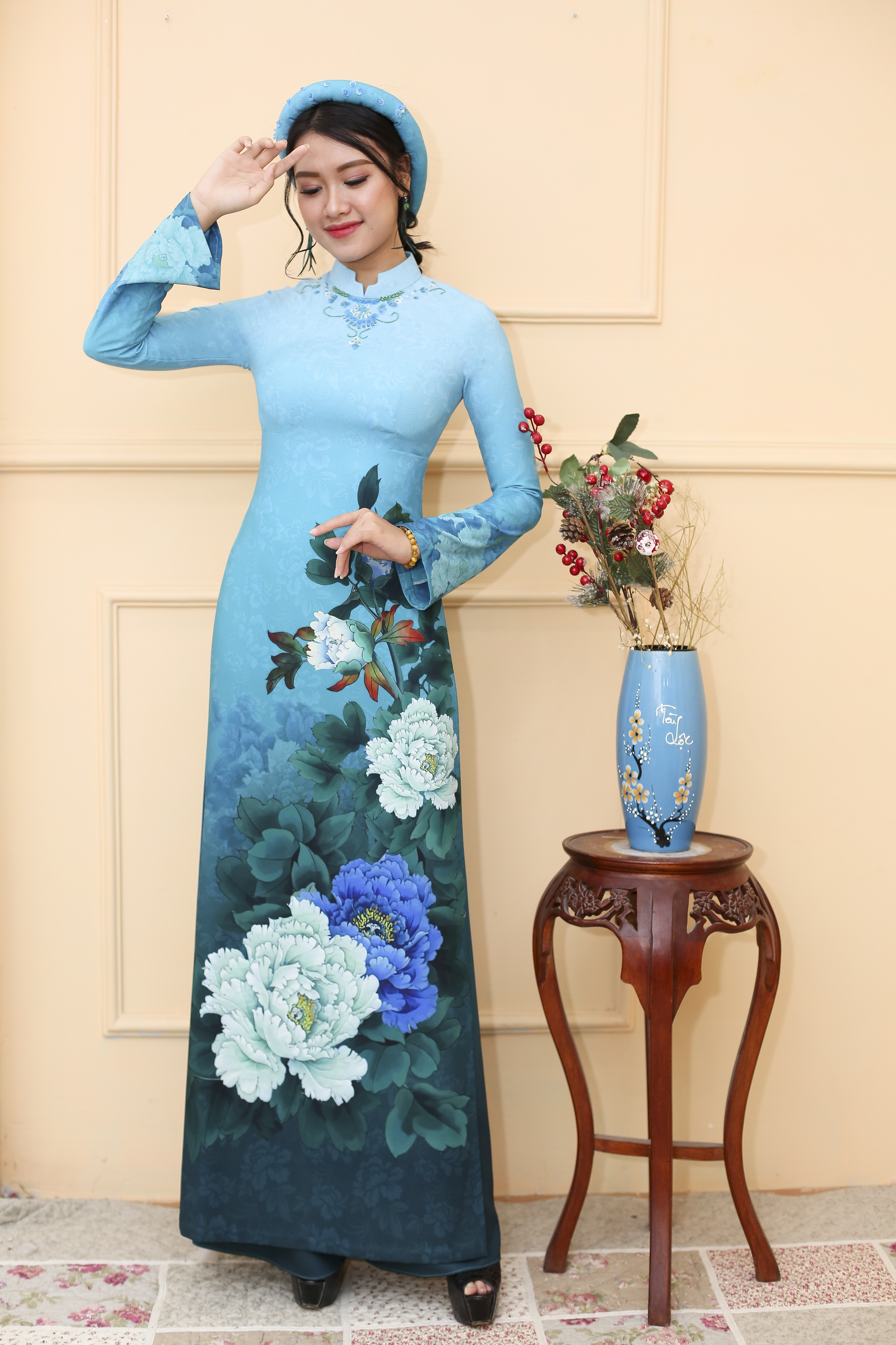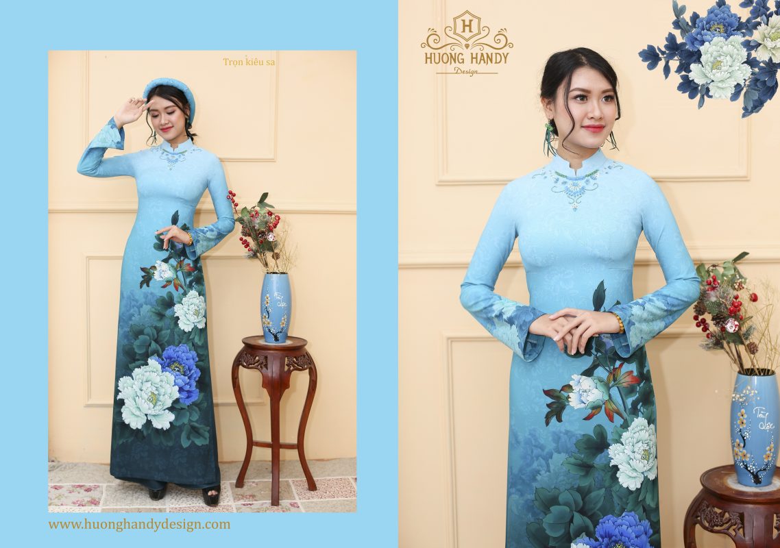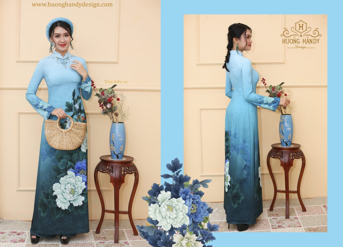 Áo dài TRỌN KIÊU SA là mẫu đặc biệt trong BST Áo dài Tố nữ chân mây, với gam màu xanh lam chủ đạo nổi bật với họa tiết hoa Mẫu đơn đại đóa mang nhiều ý nghĩa của sự thanh cao, bền vững, thịnh vượng, hạnh phúc trong hôn nhân.