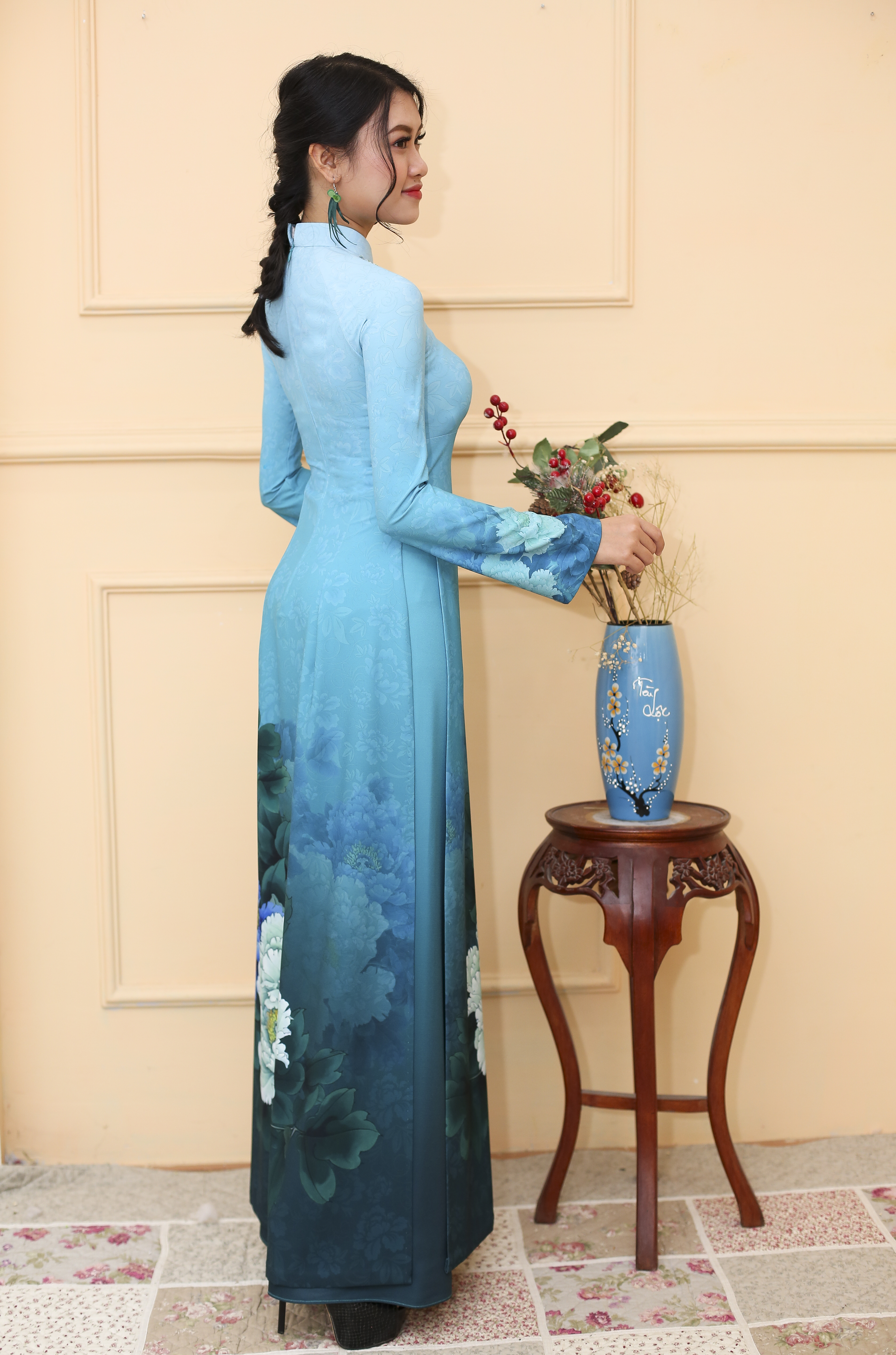 Màu sắc – Họa tiết: Nền xanh hoa chìm chuyển màu in hoa hoa mẫu đơn đại đóa.