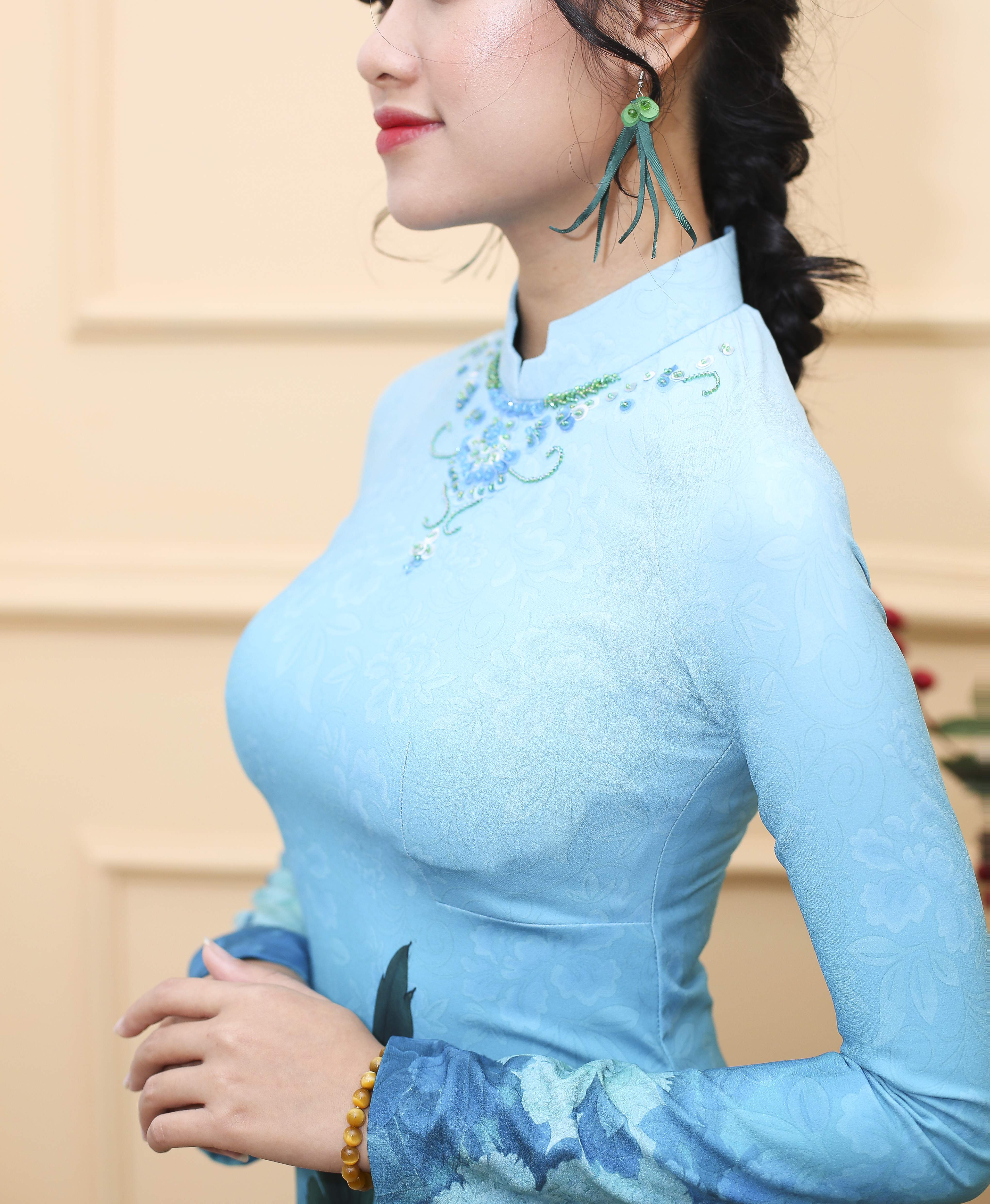 Phụ kiện đi kèm: Mấn, hoa tai thiết kế riêng cùng tông áo.