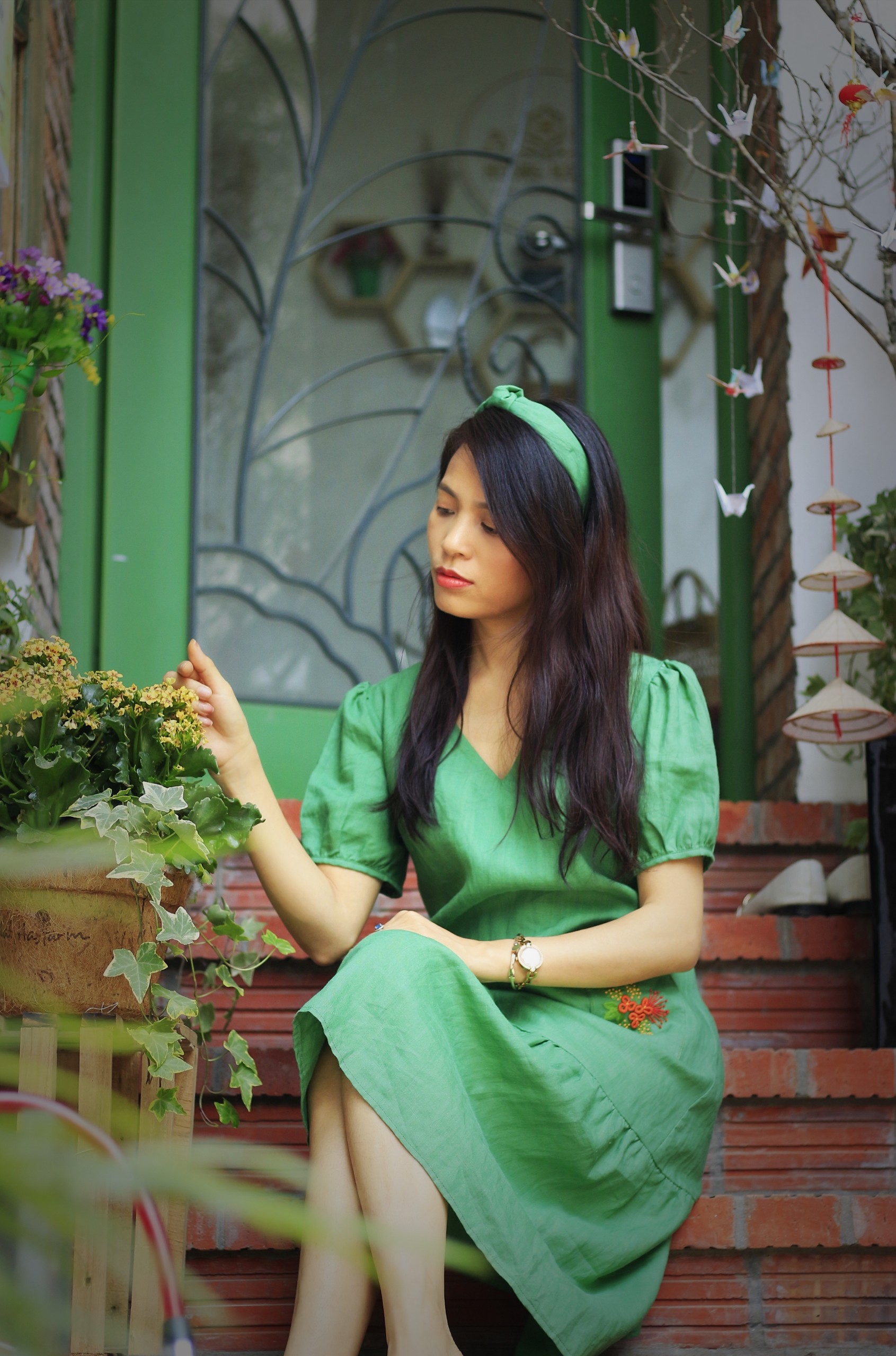Size: M (phù hợp với người từ 45 – 55 kg) Chất liệu: Vải linen tưng cao cấp, 100% sợi tự nhiên Kiểu dáng: Suông ôm xoè đuôi cá, Màu sắc – họa tiết: Xanh lá thêu tay 2 bên hông Gợi ý phong cách: mặc đi dạo phố, café, đi chơi, du lịch, chụp hình hoặc đi sự kiện, ăn cưới đều rất phù hợp và thoải mái, dễ chịu. Phụ kiện đi kèm: Bờm vải cài tóc cùng tông áo. Túi đựng đt thêu tay cùng tông áo.