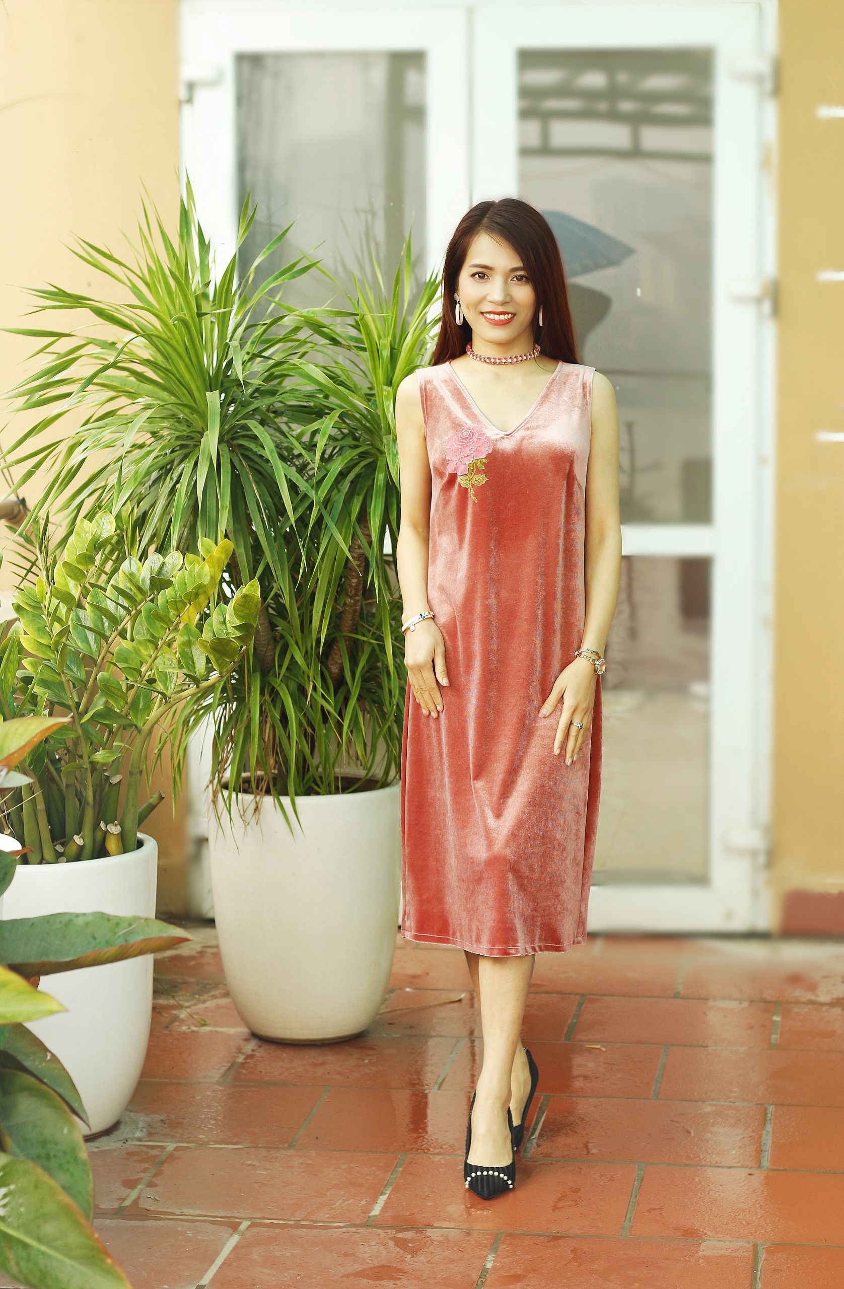 Đầm nhung hồng nude vẽ tay-HV230204-M